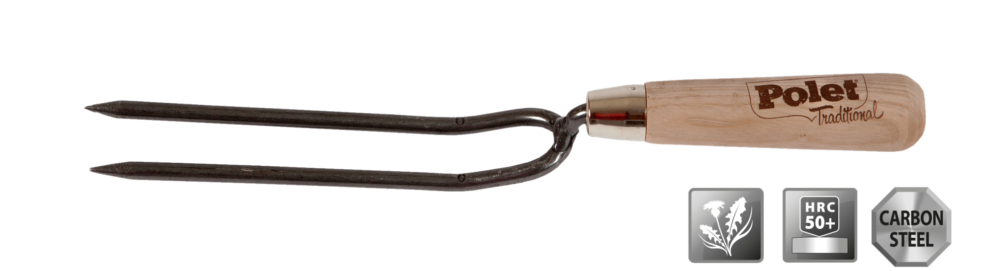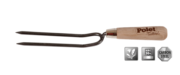 Fourche à désherber à main forgé à la main d'acier carbon avec 2 dents. Fait d'acier trempé et avec poignée en frêne.